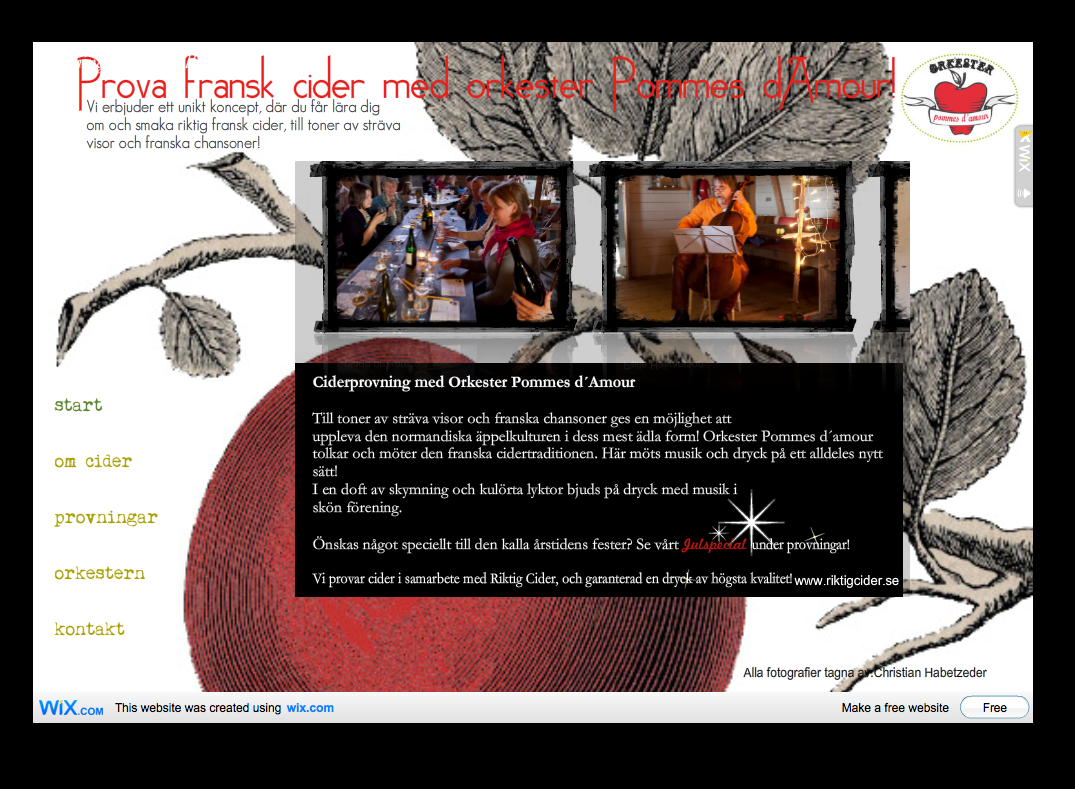 Orkester Pommes d´amour är en orkester som gör ciderprovningar! Mer information hittar ni på deras hemsida eller vill du boka dem för bröllop, företagsfest, stort, smått, högt eller lågt kan ni göra det via Anna Östlund, tele: 0708124251